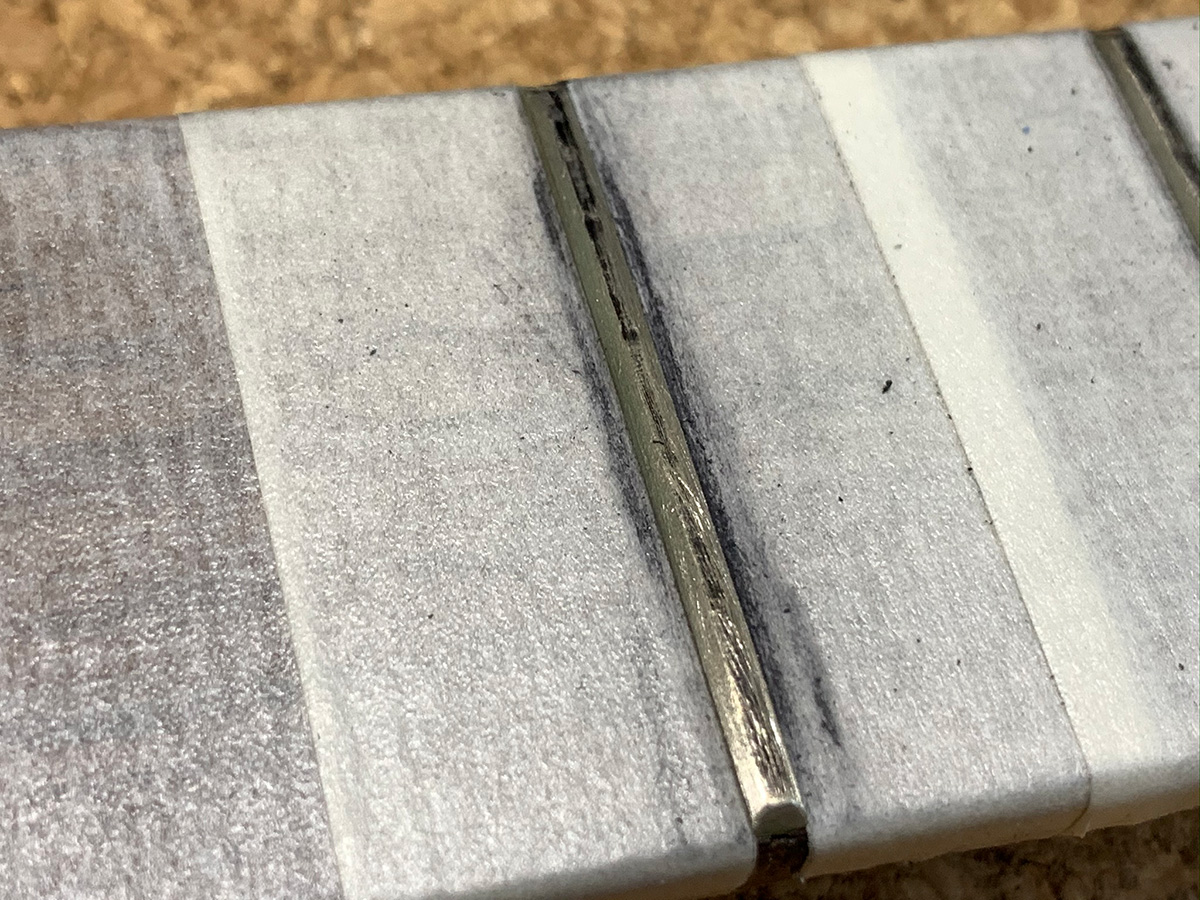 このマジックが中央に細い線上に残るように削っていければベストなんですが、手作業ではそう上手くはいきません。なので削りすぎないように。特に中央部を削って高さが変わってしまわないように気をつけるための目印としてのマジックです。