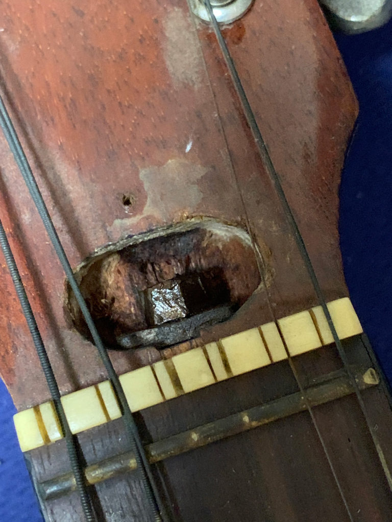 状態はというと、ペグは6個しか付いていませんし、ブリッジピンも6本だけ。ナッシュビルチューニングかと思いきや張ってあるのは主弦の6本。前オーナーは6弦ギターとして使っていたのでしょうか?